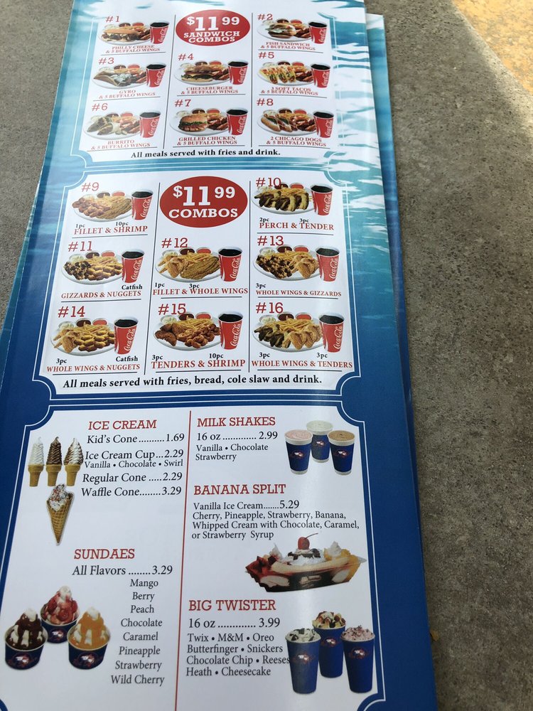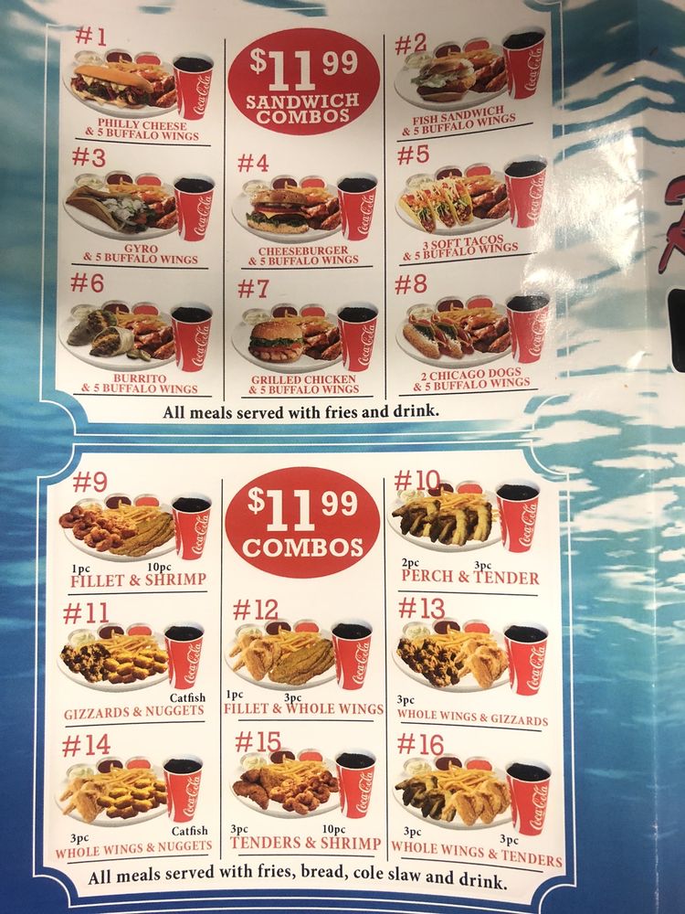 One piece of fillet and three wings.Fries coleslaw and bread 16oz drink.